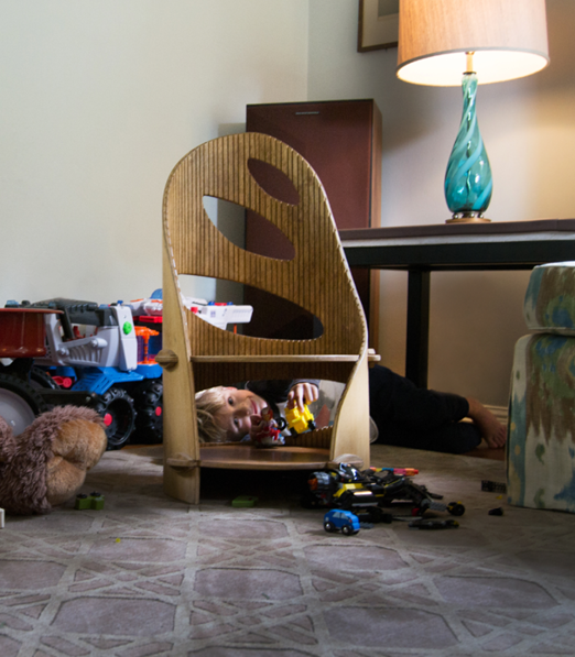 By leveraging the method of "Kerfing" allowed the wood to bend organically. This enabled the chair to ship flat and assemble cylindrically.